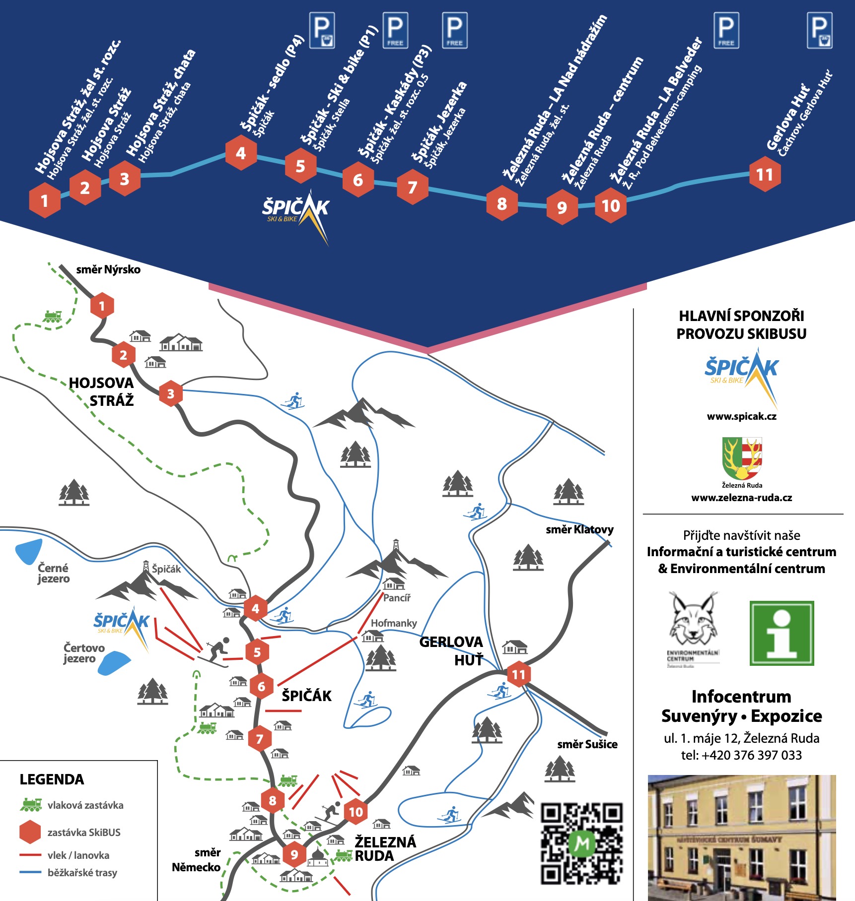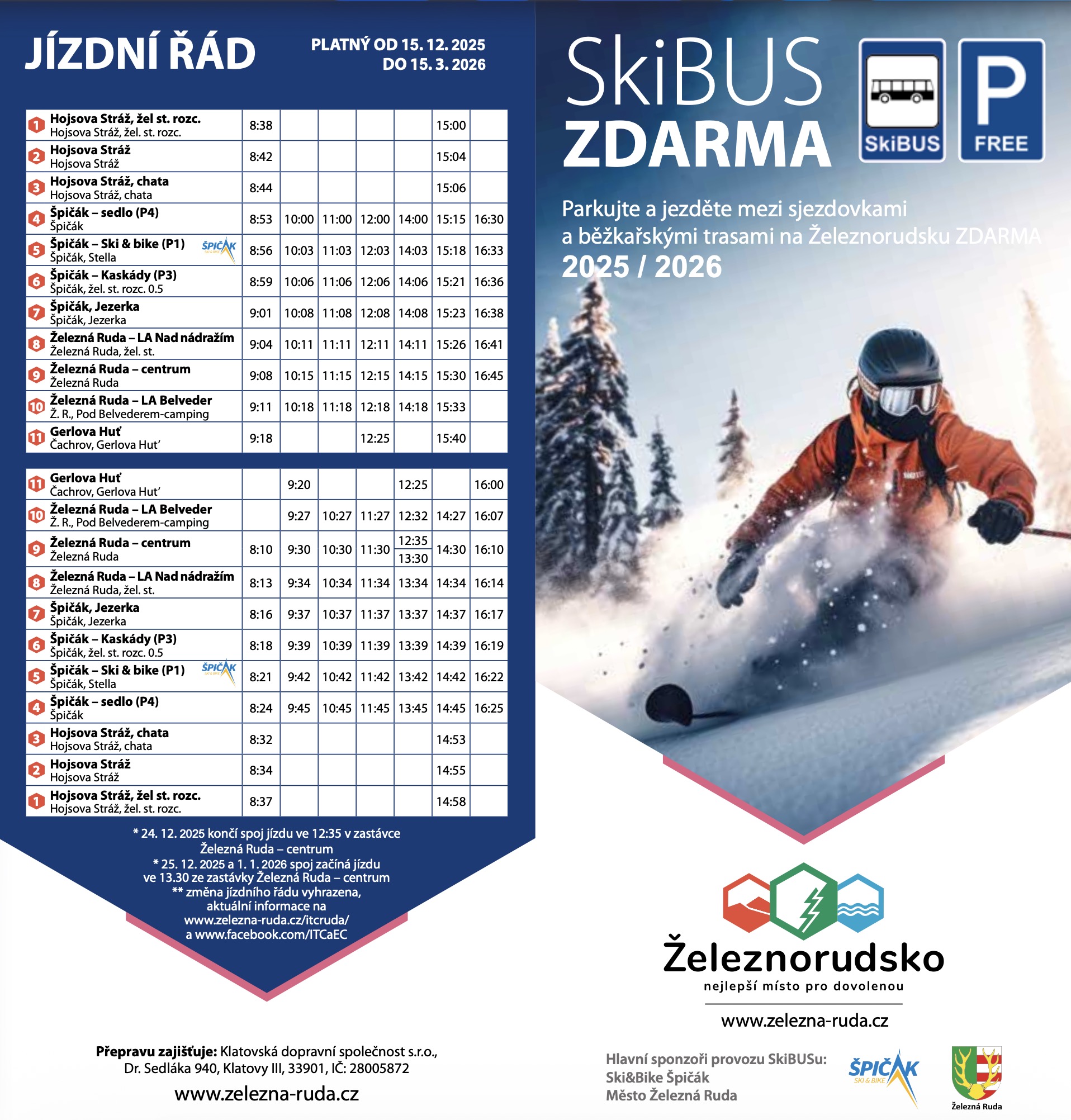 Od 15. 12. 2025 do 15. 03. 2026 jezdí zdarma ze Špičáckého sedla po všech skiareálech až do Železné Rudy a na Gerlovu Huť skibus.